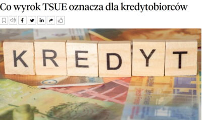 – Orzeczenie TSUE w sprawie kredytów frankowych zdecydowanie wzbogaciło argumentację prawną kredytobiorców – tak dla dziennika „Rzeczpospolita” komentuje orzeczenie TSUE Katarzyna Ignatowicz-Dębska, radca prawny w kancelarii
