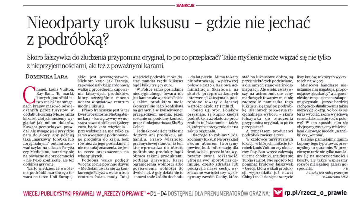 Dominika Lara, radca prawny w kancelarii MKZ Partnerzy w dzienniku Rzeczpospolita w artykule „Nieodparty urok luksusu – gdzie nie jechać z podróbką” poruszyła problem zakupu podróbek.