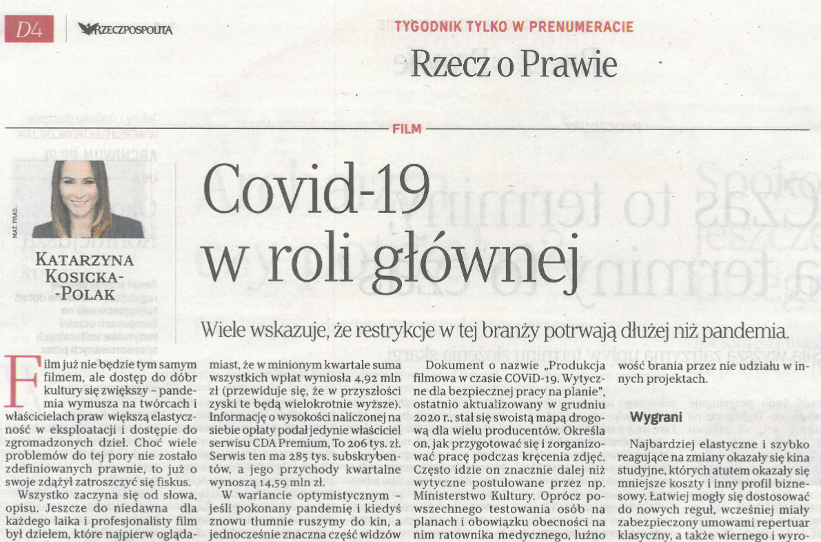 Film już nie będzie tym samym filmem, ale dostęp do dóbr kultury się zwiększy – pandemia wymusza na twórcach i właścicielach praw większą elastyczność w eksploatacji i dostępie do zgromadzonych dzieł. Choć wiele problemów do tej pory nie zostało zdefiniowanych prawnie, to jednak już o swoje zdążył zatroszczyć się fiskus – pisze w „Rzeczpospolitej” Katarzyna Kosicka Polak, radca prawny, partner w Kancelarii Michalak Kosicka Zawolski Partnerzy.